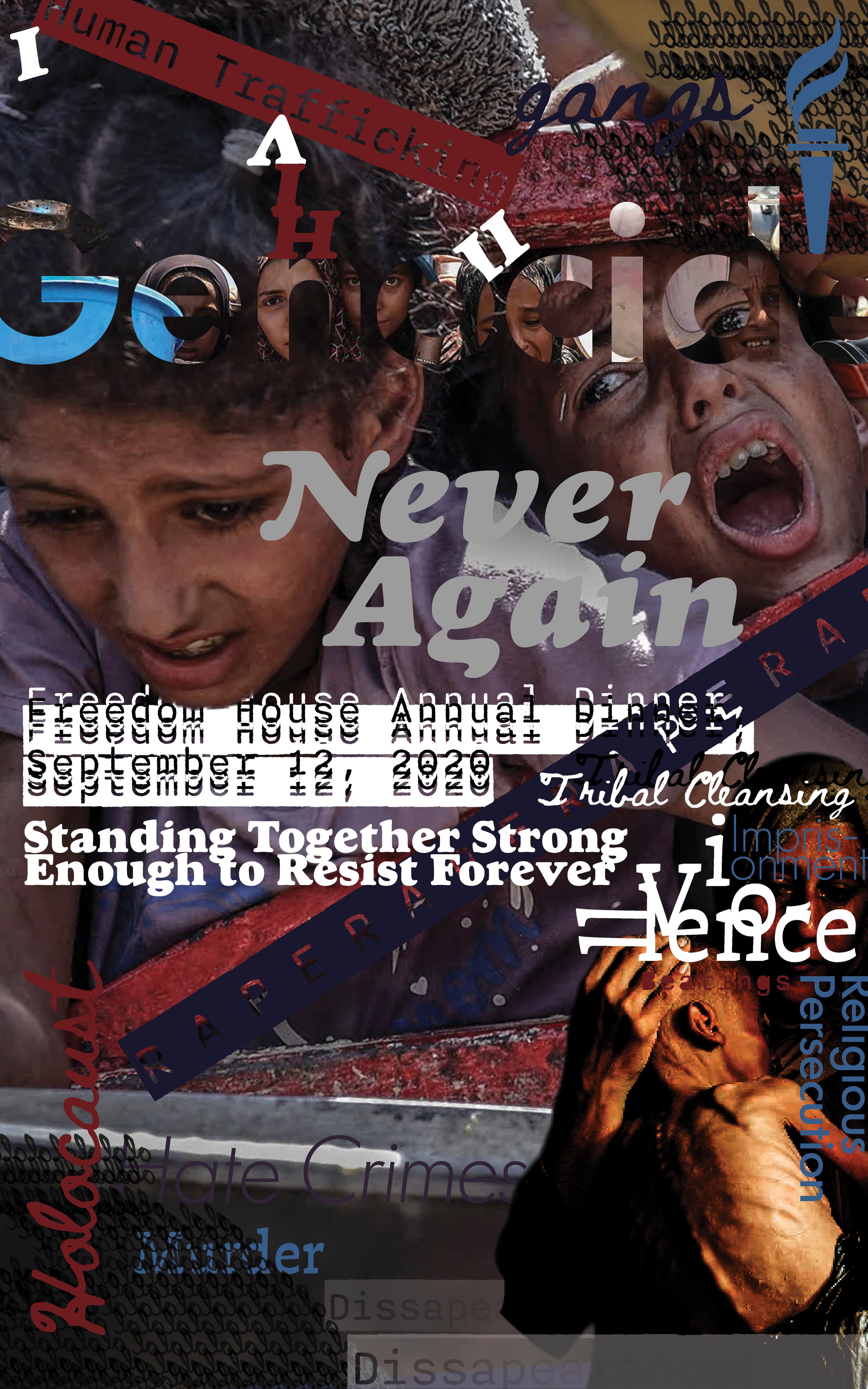 raise awareness and inspire action for the Freedom House Organization and the causes they support. Every aspect of design is used to encourage the eye to move around the design. This relates to people who are prosecuted like the ones shown in the poster and how they almost never have a moment to rest.